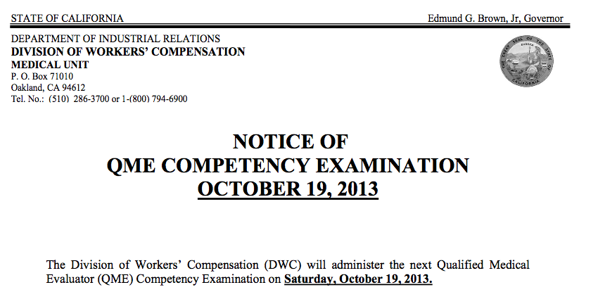 Long story short. There is a QME state-administered exam Oct. 19. This is an opportunity for medical treaters who want to expand their practices to disability evaluation of California injured workers. The test is being administered once in 2013; there is time to apply and prepare.